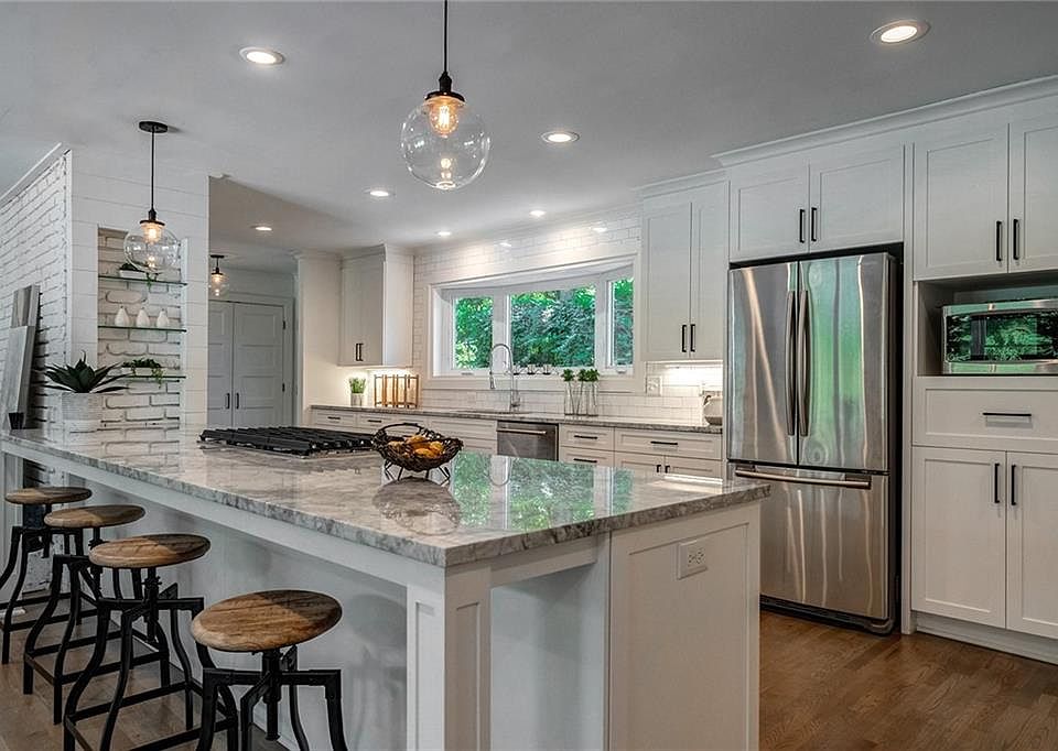 - Kitchen Features: Breakfast Bar, Eat-in Kitchen, View to Family Room, Stone Counters, Kitchen Island, Pantry Walk-In, Cabinets White