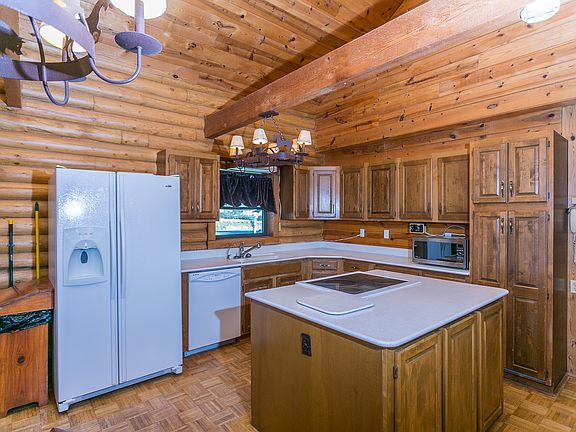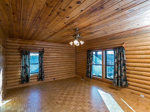 Well maintained Log Home situated on a .75 acre lot with mature trees, fruit trees, rose bushes, garden and greenhouse. This private setting backs up to state land with amazing views and is fully fenced. Walk in to the open floorplan with beautiful t&g wood throughout. Maple Cabinets w/center island in Kitchen and corian countertops. Bedroom and bathroom on the main level, Loft Master Suite upstairs. Lots of potential in the finished basement area for 3rd and/or 4 bedroom plus living area,game room, or craft room with it's on entrance. The oversized garage is complete with a workbench and full bathroom. Relax on the covered porch or enjoy the spa in the backyard.