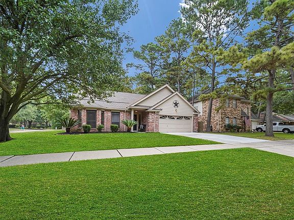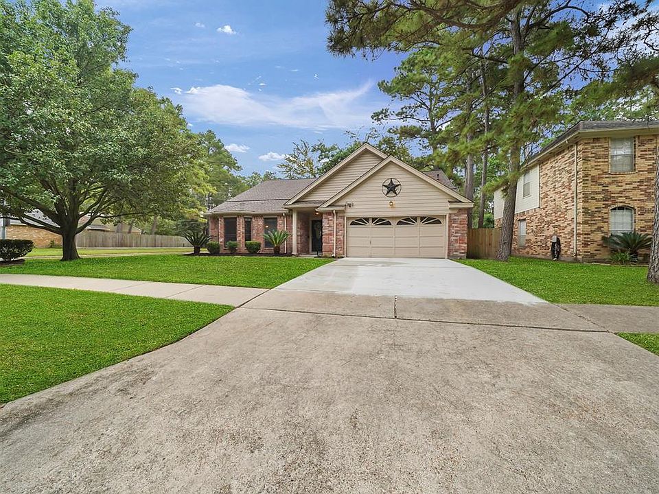 Oakwood Glen single story! Beautiful home on immaculate corner lot with brick exterior and dual driveways. Attached garage with epoxy flooring. Great floor plan with formal dining, updates to baths and kitchen, hand scraped laminate flooring and recentl bedroom carpeting. Spacious living area with wood burning gas connection fireplace. Large kitchen with updated granite counters and backsplash, a breakfast bar and gas range. Large walk in pantry. Owner suite with sitting area and dual walk in closets features a private bath with Whirlpool/jetted tub and separate glass enclosed shower. Spacious secondary bedrooms with updated bath! Fenced backyard with screened patio and storage shed. Zoned to Klein ISD. Two community parks, playground, walking trails, community center and tennis courts. Other updates: Water heater (2020), partial driveway (2020), sprinkler system, (back, 2020, front 2019), roof (2019). HVAC (2017). Transferable lifetime foundation warranty available. Call today!