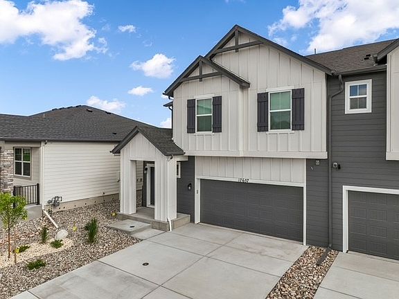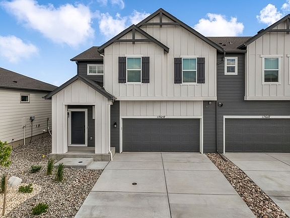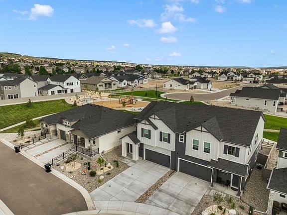 This is a Classic Home that was completed in May 2024 with incredible mountain views. There has only been 1 immaculate renter for 1 year. Hillside 2-story plan with 2 car garage in the new Monument Junction Cadence Collection neighborhood. 3 bedroom, 2.5 bath home. Farmhouse style exterior. This home is one side of a duplex. Kitchen features knotty alder Shaker-style cabinets in a smoke gray finish, elegant honed Artisan Grey Quartz countertops, island, pantry, and stainless steel appliances including gas range. Off of the great room there is an under-stairs storage closet and separate coat closet. The rear patio is conveniently accessed through sliding glass doors off of the dining room. The upper level master bath showcases a shower with seat and sleek frameless shower surround, double sinks, and walk-in closet. The master bedroom is separated from the additional 2 bedrooms creating a quiet, serene space. The upper level also hosts a loft and a laundry room. Home comes equipped with air conditioning and smart home package. Home is located in a covenant controlled community and backs to green space with a park. This is a pet friendly home.