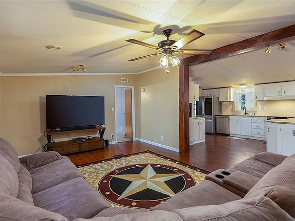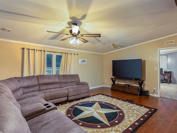 This property features a 1998 DW home on 3.43 acres. Many updates including granite countertops, new flooring and interior paint. It has a fenced backyard, large oak trees, some open pasture area and some nice flowering vines. It has a 30X50 shop w electric, 3 rollup doors, a car lift & large compressor that stays. Every man's dream! It also has a 20X20 garage workshop and a 13x10 storage building. There is an oilfield tank at the back of the property with pipeline easement but plenty of room for horses or animals on the acreage. This home has been moved before. Come to the country but still be close to town, schools and shopping.