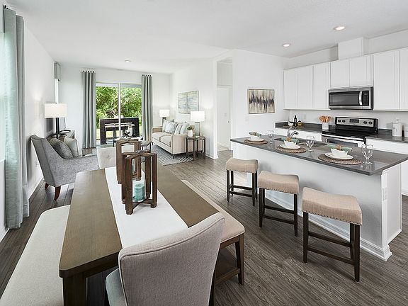 The open floorplan allows you to prepare meals without missing the conversation in the great room and dining space. Dusk cabinets with Simply Beige Quartz countertops, Ashfield Plank Sea Glass EVP flooring with multi-tone carpet in our Lavish package.