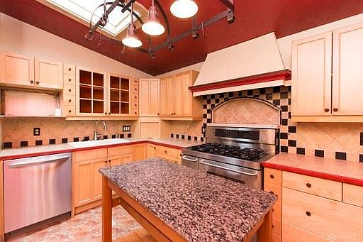 You will fall in love with the beautiful 3 bedroom 2 bath in Beavercreek. Wood burning fireplace and stove. Gourmet kitchen with all appliances, including Kenmore Elite five burner gas stove with double oven. The kitchen has an abundance of cabinets, lots of Italian tiled counter space and decoratively lit built in display areas and a sky light. Jacuzzi bathtub in upstairs bathroom featuring a skylight and a window with view of the beautiful backyard. There are three bedrooms, two large and one smaller perfect for an office. Downstairs 'Master suite" with large laundry room with walkout to the huge fenced in backyard. Beautiful mature trees and a custom built deck makes for enjoyable outdoor entertaining. European fixtures throughout the house with Italian tile and wood floors. Over sized two car garage and parking for additional vehicles in the large driveway. newer roof (2017), gutters (2017), furnace (2010) and dishwasher (2017)