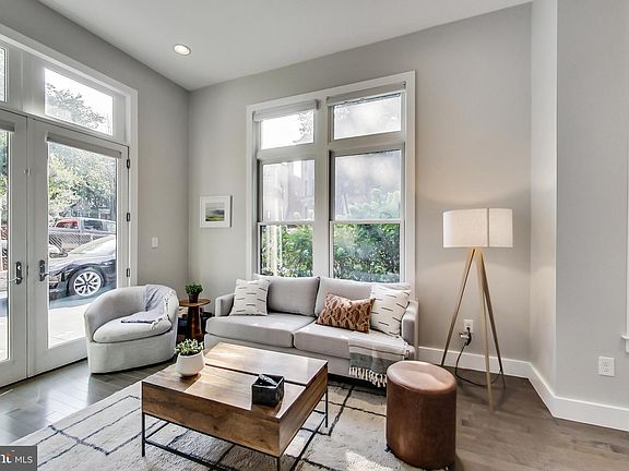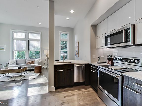 Step into over 1,100 square feet of elevated city living featuring dramatic 10-foot ceilings, curved architectural walls, and enormous windows that flood the home with sunlight. This main-level residence is the only unit in the building with a private entrance, offering the ease of a penthouse vibe without the climb. The contemporary two-tone kitchen is outfitted with quartz countertops, KitchenAid appliances, and an open layout ideal for hosting or unwinding. Hardwood floors and luxe porcelain tile baths continue the upscale feel throughout. Both spacious bedrooms offer generous closets, with the primary suite featuring a modern ensuite bath. A full-size washer/dryer is conveniently tucked into the layout. Outside, you’ll find tandem parking for two cars—your reserved spots are directly in front of your private entrance, with space behind it for your second vehicle, or visiting guests. Well worth the $200/mo rental fee. Set on a quiet one-way street, this pet-friendly boutique building offers low condo fees and a shared side yard perfect for grilling or letting Fido play. Located between 18th Street and Columbia Road, you're steps from neighborhood favorites like So’s Your Mom, Pitango Gelato, Tryst Coffeehouse, Safeway, CVS, The LINE Hotel, and the newly opened Her Diner. Dupont Metro is just a short walk away for easy access across DC. All dimensions approximate