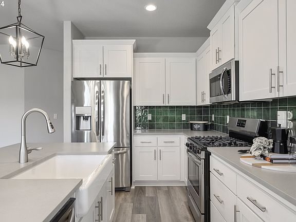 Beautiful 2 Level home on large greenspace lot. Open kitchen, Extra Large Island with seating, Quartz Countertops, Gas Stainless steel Appliances, Custom tile backsplash, stainless steel farmhouse sink and pantry. Spacious and Light filled great room with dining nook. Large slider to patio and fully fenced yard. Upper level has laundry room, large primary suite with beautiful trey ceiling, two sinks and a huge walk in closet! Photos are of a model home.