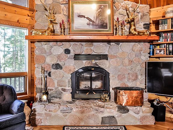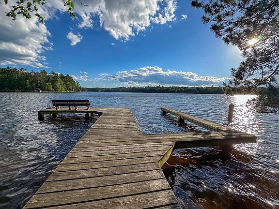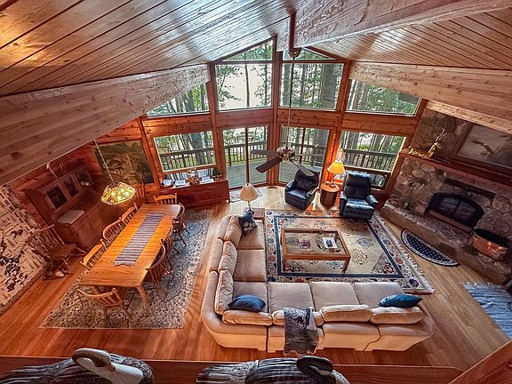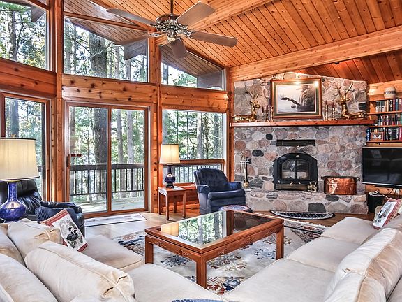 Perched on the shores of Yellow Birch Lake on the Eagle River Chain of Lakes, this cedar-sided 1.5-story home boasts a wall of south-facing windows that bathe the open living spaces in year-round sun and welcome cool summer breezes. The large stone fireplace warms the space on cool fall evenings. The wrap-around deck with wide, gradual steps, an open area, and a screened porch (also accessible from the kitchen/dining area) provide perfect spots for relaxation. The loft features a private primary bedroom suite, while the main floor offers another bedroom and full bath, along with main floor laundry. The lower level includes a third bedroom and bath, family room, kitchenette, two additional bonus rooms, and a gas stove. Enjoy lakeside living with a gradual walk with steps to the lake, a beautiful pier, and sandy frontage. Completing the package is a detached oversized two-car garage and a black-topped circle drive.