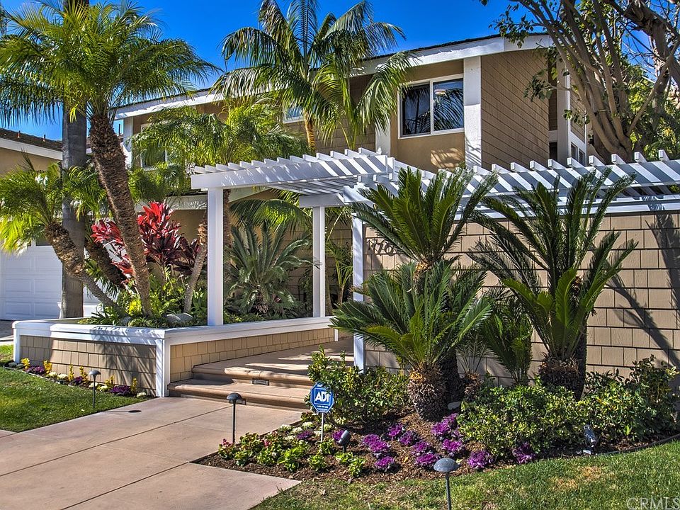 Walk through the newly rebuilt trellis, to enter this semi-custom detached home with vaulted ceilings and natural light. Features a family room and master suite, expanded during the original construction by 300 sq. ft. (approx.) Hardwood flooring from entry thro' the family room, kitchen and downstairs bathroom. The staircase/railing system was reconstructed, and newer interior doors, plantation shutters, and crown molding/baseboards added throughout. The living and dining rooms have been enlarged, enclosing the original indoor atrium. This space has a fireplace with a custom-built mantle rising to the vaulted ceilings. To improve roof drainage, the flat roof over the dining room/old atrium space was replaced with a pitched roof. A large skylight was added to the enclosed atrium to allow more natural light. The kitchen includes Quartzite counters, stainless steel appliances, sink, and faucet. The family room has a fireplace and an 8' built-in cabinet. The master suite features wood beamed ceilings and a fireplace. The master bathroom boasts a jetted tub, walk-in shower, separate toilet, two separate sinks, and a large walk-in closet. The BBQ area in the yard has been plumbed for natural gas. The garden boasts a water feature, planters, mature trees, sego and kentia palms. There is an outdoor enclosed structure of 260 sq. ft. (approx.) which was rebuilt in 2018. The garage includes epoxy floors (2019), a newer insulated roll-up garage door, built-in cabinets, and loft storage.