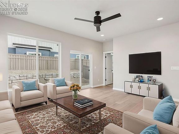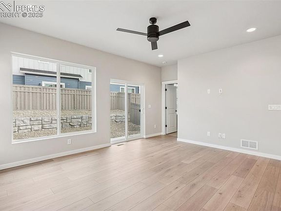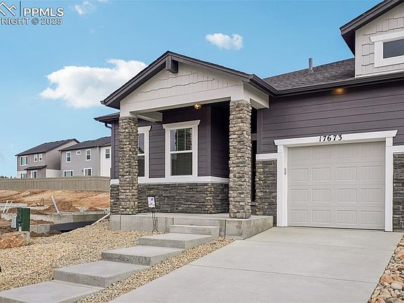 Ready now! Valley ranch plan with 1 car garage in the new Monument Junction Cadence Collection neighborhood. 2 bedroom, 2 bath home. This home is one side of a duplex. Kitchen features Shaker-style white cabinets, crisp Frost White Quartz countertops, island that seats 3, pantry, and stainless steel appliances including gas range and refrigerator. The main level master bedroom hosts a walk-in closet. The primary bath showcases a shower with seat and vanity with double sinks. The primary bedroom is separated from the secondary bedroom creating a quiet, serene space. Enjoy the outdoors on the rear patio accessed from the great room. Home comes equipped with blinds in the bedrooms and bath, air conditioning, smart home package, radon mitigation system and washer/dryer. Home is located in a covenant protected community. Seller incentives available. Full yard xeriscaping included.