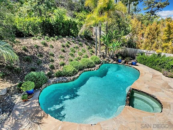 This beautiful and spacious home sits on a large lot in the desirable Gatewood Hills neighborhood with rolling topography and mountain views. Light and bright with vaulted ceilings. An entertainer's dream backyard that is a private and peaceful tropical oasis with a pool, spa, pergola and shade trees. Downstairs bedroom and full bathroom off the main entry. Large master suite with balcony overlooking the pool and a cozy nook at the top of the stairs perfect for an open office/study space. No HOA and no Mello-Roos. Optional membership available to the RB Swim and Tennis Club which host events including movie nights and has swimming pools, jacuzzis, tennis courts, pickleball courts, racquetball courts, a fitness center, playground, basketball, gym, and a community room. Award winning Poway Unified School district and steps to the highly sought after Chaparral Elementary School. Close to the Rancho Bernardo Inn and golf courses, and about 2 miles to the I-15. Notable highlights include recent interior painting, new water heater, newer HVAC, backyard gas hookup, and an exterior paint coating that keeps house cool.