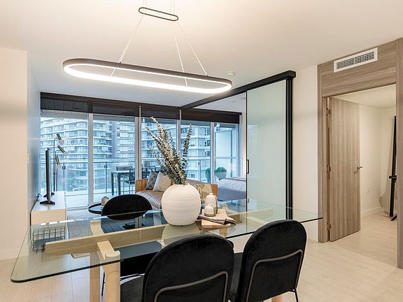 Water views from every room, downtown & mountain skyline behind, above lush gardens & water features of Avenue One with no road noise. Air-conditioned living space grows w/ the flex 2nd bedroom and extends through floor-to-ceiling sliding doors spanning the width of the home, onto the covered, heated year-round patio w/ gas. 2 bedroom & office home for those seeking luxury of custom millwork, Miele SS appliances incl. gas range, integrated double-door fridge, wall & speed ovens -marble backsplash, 3-zone wine fridge, large custom walk-thru closets & 5-piece marbled master ensuite. Xtra-wide parking spot has EV parking + double locker. World-class amenities incl. 24-hr concierge, gym, dog walk & car wash. Steps from waterfront, skytrain & Olympic Village restaurant & shops. Showings by Appt