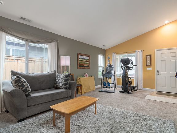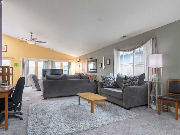 Discover the epitome of contemporary living in this captivating single-level residence located in West Eugene, Oregon. Boasting vaulted ceilings, an open living concept, and a host of modern amenities, this home offers a perfect blend of style, comfort, and convenience.As you step through the front door, you're greeted by a bright and spacious living area adorned with vaulted ceilings and large windows, creating an inviting atmosphere filled with natural light. The centerpiece of the room is a cozy gas fireplace, providing warmth and charm while serving as a focal point for gatherings with family and friends.The adjacent kitchen is a chef's dream, featuring maple cabinetry, gas appliances, and ample counter space for meal preparation. With its seamless flow into the dining area and living room, the kitchen facilitates effortless entertaining and everyday living, making it a true hub of the home.Retreat to the tranquil primary bedroom suite, complete with a walk-in closet and a private ensuite bath for added comfort and privacy. Two additional bedrooms offer versatility and space for guests, a home office, or a hobby room, ensuring everyone has their own retreat to enjoy.Outside, the low-maintenance yards and brand-new fence provide a private oasis for outdoor relaxation and enjoyment. Whether you're hosting a barbecue on the patio or simply soaking up the sunshine in the peaceful surroundings, the outdoor space is sure to impress.Conveniently equipped with a new HVAC system for year-round comfort, a 2-car garage for parking and storage, and gas appliances for efficiency, this home is designed to enhance your lifestyle while minimizing maintenance and upkeep.Located on a quiet street in West Eugene, this property offers the perfect balance of tranquility and accessibility, with nearby amenities including parks, schools, shops, and restaurants. Don't miss out on the opportunity to make this modern retreat your own ? schedule a