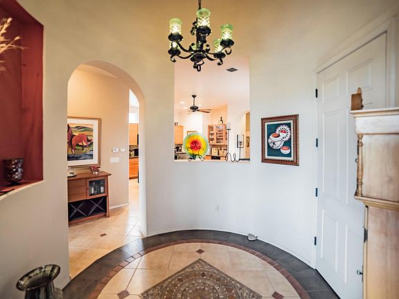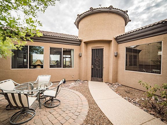 If magnificent views of the mountains and golf course are high on your list...this home is a MUST see. From the moment you step into the courtyard entrance and hear the sound of water coming from the fountain (conveys) you'll be smitten. You enter the home into a circular foyer with a soaring ceiling and arches that lead to the living room and another arch to the kitchen. There is a gas FP with a fan that will keep you toasty warm on a cold winter's night. The beautiful kitchen has granite counters, a wine refrigerator that conveys as well as plenty of counter & cabinet space. In back are WOW views of the golf course and mountains. This special home has a screened in AZ room that adds living space nearly year-round. A perfect spot for watching southwest sunrises & sunsets.