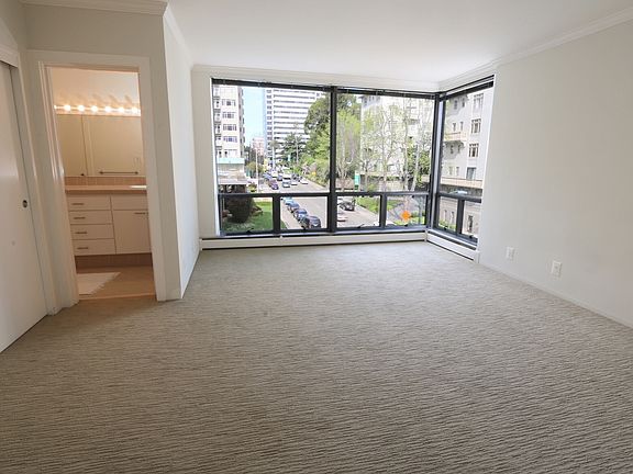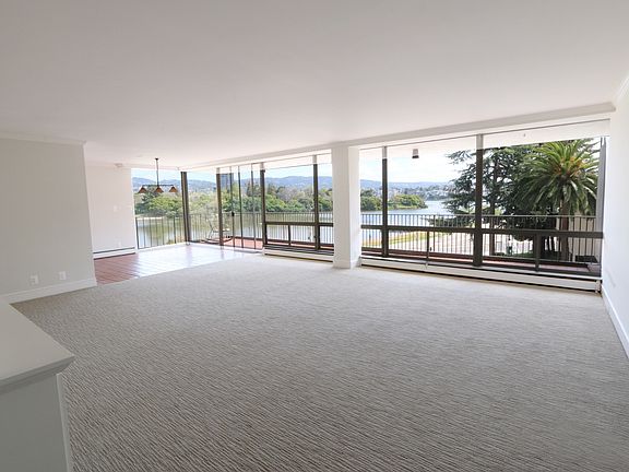 Are your clients empty-nesters? Are they ready to downsize? Would they like to live in a large clean space, within a secure building, located conveniently near restaurants and Whole Foods........ all level-in Would they like to wake up to beautiful lake views? This is a very secure 24 hour (doorman) mid-rise, just overlooking Lake Merritt. If your clients like to travel for a month (or even two), and and they want to leave their worries behind, they'll certainly appreciate the security of this living space. They can be reassured that while they're away, all of their packages, newspapers, and mail will be placed in a secure place. The building, known as the Lake Royal Apartments, is a classic Mid-century with clean lines, is a simple and elegant. The 2nd floor unit is a generous 1,535 sq.ft., boasts simple lines which enhance the feeling of being in a larger space. There is an expansive dining and living room space which opens to a beautiful full view of the lake. Enjoy waking up to coffee, and relax while you take in the lake view from your favorite chair. The unit has been recently painted. High quality carpeting was just added. The ample master bedroom (12'x16') will easily accommodate your kingsize bed and most of your large bedroom furniture. The spacious master bath includes a double sink and a shower stall. The kitchen is bright and airy, has all new stainless steel appliances, including a dishwasher. The balcony is an impressive 6 feet x 34 feet, gives you an opportunity to develop your green thumb'. Take advantage of the abundant morning light. There are two elevators: passenger and service. For your overflow, there is good-size extra space located in a secure room, and laundry facilities in building. The assigned parking for this unit is conveniently located near the service elevator, so you can off-load your groceries in short order. Relax on the roof or just marvel at the view during sunset. The building is just a five minute walk to 19th St Bart Station, or a ten minute stroll to Whole Foods. There are simply too many restaurants to mention. Chinese food one night....Spanish food the next! $4,500 / month w/minimum. 1 yr lease includes: PG&E, Water, garbage, secured parking, storage space, 24 hour doorman security, Direct TV with HBO package. No cats, but may consider a dog, up to 25 lbs..