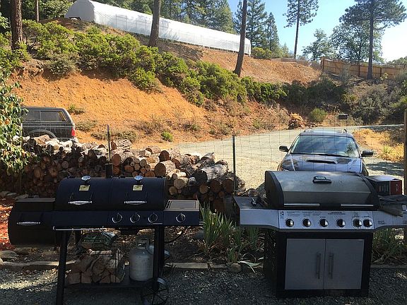 1 bed 1 bath upstairs with kitchen ,master living/dining room with loft/office/trundle bed and 1 bed 1 bath downstairs with full kitchen, living/dining room , bathroom ,bedroom and pantry, main level has wood cook stove and 38kw heat pump with AC , open beam vaulted ceilings , basement living has separate entrance with pellet stove , full kitchen , bedroom living/dining room and walk in pantry, huge wrap around deck, custom built 10 person sauna with skylight, large garden shed, large carport, 8x40 permitted shipping container with electricity large 8x40 shed newly constructed, all new metal roofs on all buildings,,detached finished garage with heat and full bathroom, detached cabin with loft and bunk beds, fridge and pellet stove , 3 engineered and permitted greenhouses , over 55,000 gallons of water storage whole home filtration with 3 wells all on 15 south facing acres