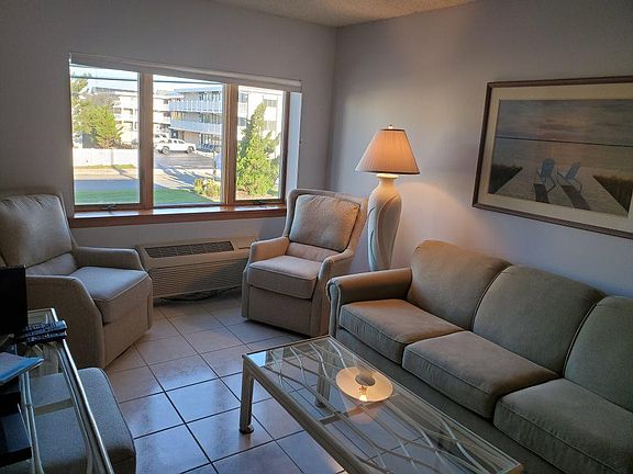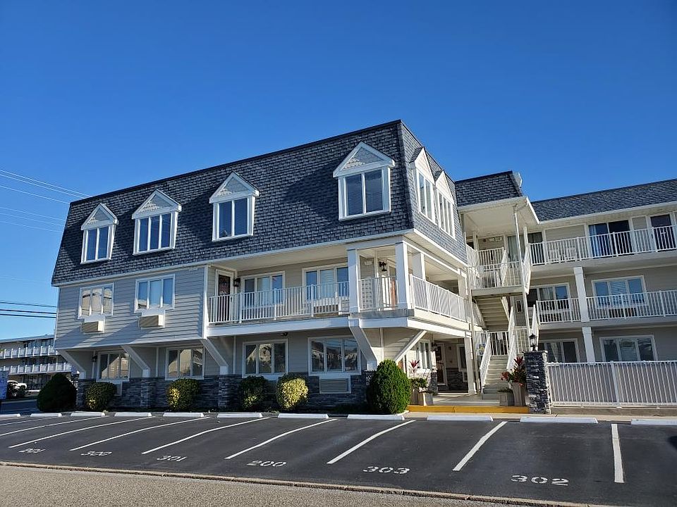 Beach Block - South Avalon, Oversized Condo. This second floor Merrimac Condo offering the best of all worlds. Completely renovated and decorated. Heated swimming pool and you never have to cross a street on your way to the Beach or Restaurant. This one bedroom condo sleeps four and is located in a very private area, away from the pool and tenant traffic. It has been totally renovated, new kitchen with granite countertops, stainless steel appliances, slim-line microwave, modern cabinets and white ceramic tile flooring. New bath, shower and self-contained washer/dryer. Large bedroom with Queen size sleeping accommodations along with a pull-out sofa. All of the furniture is new along with the dcor, including two flat screen TV's.