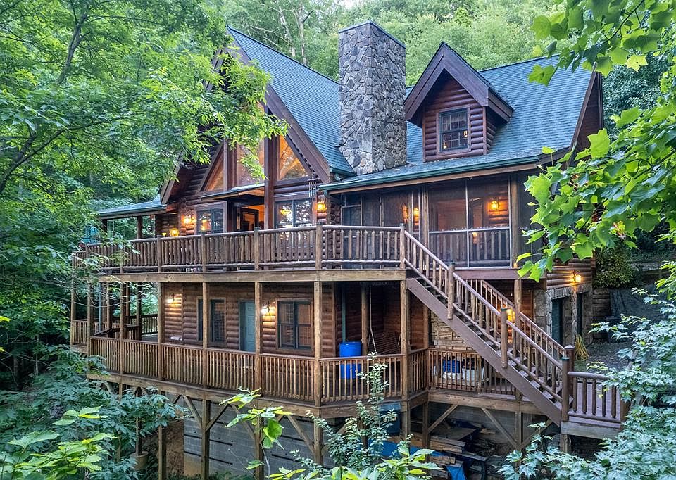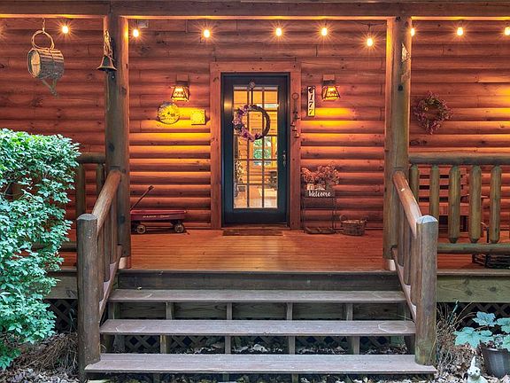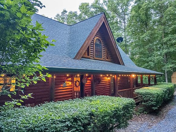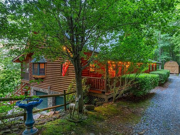 This home has it all! Custom built, rustic log home with 22 ft. high vaulted ceilings, the most gorgeous wood beams you've ever seen, lots of windows and natural light. T&G woodwork throughout the 1st and 2nd floors. Main level laundry & mudroom. 1st level primary bedroom w/ ensuite, large walk-in closet & french doors that lead you out of the bedroom to the screened porch area. Huge kitchen with nice size island, breakfast bar, pantry, ample amount of cabinet and counter space. Gas log stone fireplace in the living room. 2nd level offers two size-able bedrooms, a bathroom and bonus loft area. Lower level offers a family room/entertainment space, full bathroom and bonus room for additional sleeping space. There's a nice spot to add a kitchenette too. The lower level leads out to the attached garage and a separate workshop room. Plenty of storage space throughout the home. Covered front porch, multiple decks on the back of house. Enjoy the outdoors with a nice, serene setting, a waterfall, professional landscaping, fire pit area & plenty of entertainment space! End of road privacy and gate. Best Internet in town! Short-term rentals are Allowed & Welcomed! Newer HVAC & Roof!