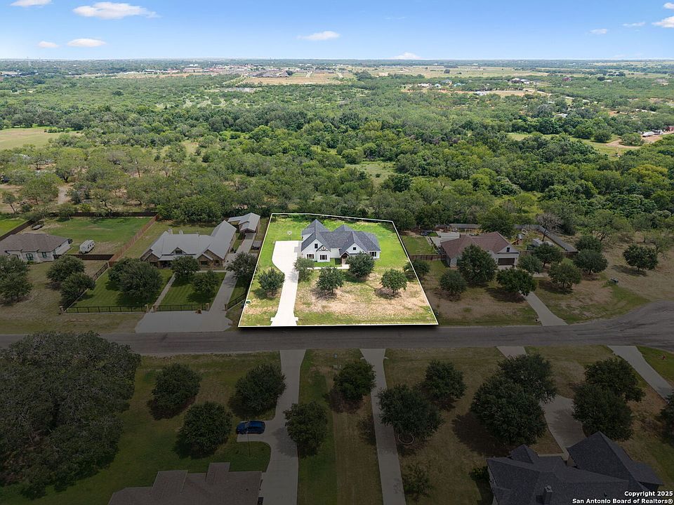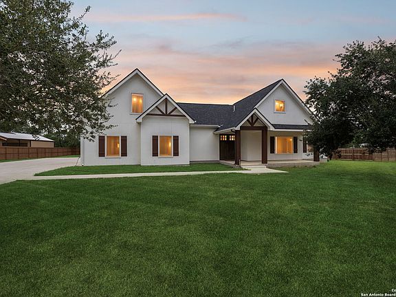 OWNER FINANCING AVAILABLE! $5,000 SELLER CREDIT & 1% LENDER CREDIT OFFERED! Your opportunity to own a truly UNIQUE custom-built home, offering 3,316 sqft of thoughtfully designed living space on a flat .75-acre lot with no rear neighbors, backing up to a private ranch.This modern open-concept home features 4 bedrooms and 4 full bathrooms, including a spacious primary suite with a luxurious bath - complete with a vintage-style standalone tub, rain shower, and a large walk-in closet with its own private laundry area. Bedrooms 2 and 3 serve as guest suites with their own bathrooms, while the 4th bedroom stands out with vaulted ceilings and a unique hidden loft accessible by ladder! The home features a chef's kitchen with gas cooking, a pot filler, white quartz countertops, a massive walk-in pantry, and a wet bar in the living room. The living area is enhanced with tray ceilings, ceramic wood-look tile throughout, and two massive solid wood beams that frame the welcoming front entrance. Upstairs, you'll find a fully pre-wired media room with surround sound connections, along with an attached office and bonus room that can easily be used as a 5th and 6th bedroom if needed. This property also includes two laundry areas - one conveniently located inside the primary suite's closet and a second on the opposite side of the home. The 2-car garage offers built-in storage and a dedicated mop closet, while additional storage can be found throughout the home. The large covered patio comes pre-plumbed for an outdoor kitchen, and the entire property is equipped with a security camera system, with all appliances included in the sale. The lot is pre-plumbed and pre-wired for a future pool and pool house, offering even more possibilities for outdoor living. Located just 30 minutes from Downtown San Antonio and minutes from I-35, this one-of-a-kind property perfectly blends modern living, thoughtful design, and space to grow!