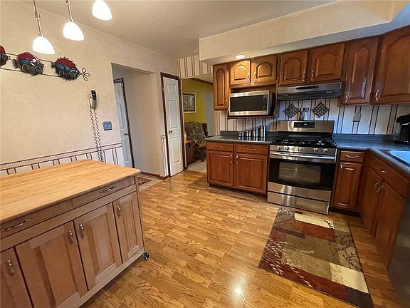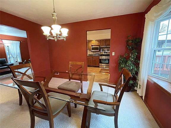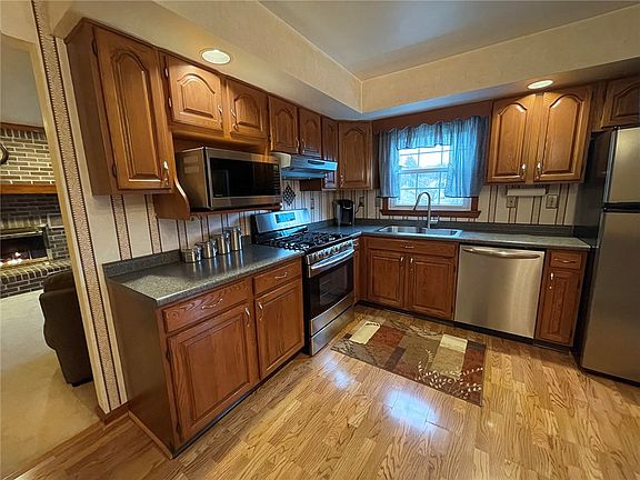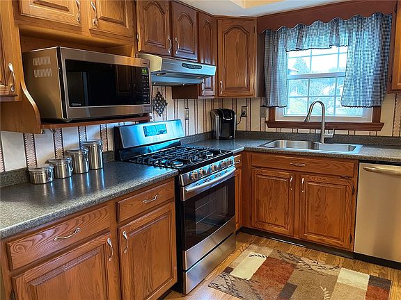 Large eat-in kitchen features a rolling island, oak cabinets, pantry, and stainless appliances. The formal dining room has a pretty bay window that plants love, or snuggle in the cozy family room with a gas fireplace. Step outside and enjoy your covered back deck, and your pup will love the fenced yard.