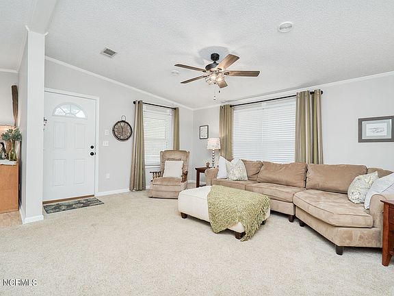 Beautifully appointed canal front home in waterfront neighborhood. Albemarle sound just minutes away. Spacious living room open to the eat in kitchen featuring full appliance package and Corian countertops. Attached Carolina Room offers additional entertaining space. Enclose pet area with access to fenced backyard. Two story barn with second story home office/craft room. Primary en-suite features double vanity, tub/shower combo AND separate stand up shower.