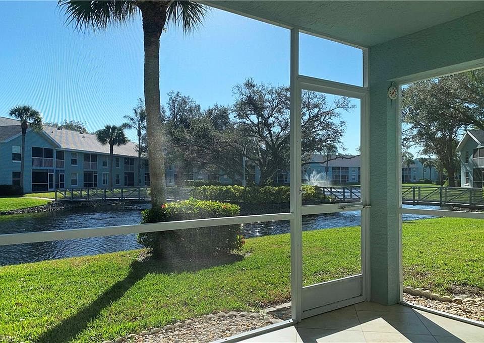 This light and bright GROUND FLOOR 2+DEN END UNIT features WRAP AROUND WATER VIEWS of the lake with Southern exposure as well as the bridge and two fountains. Updates include new granite counters, fixtures and updated cabinetry in the kitchen and both bathrooms. The den can easily be converted into a third bedroom if need be. GREAT LOCATION within the complex right across from the big resort style pool and situated on a low traffic cul-de-sac street. Well established complex with NEWER ROOFS, covered parking (carport space,) two pools and among the lowest condo fees in North Naples. Also pet friendly, NOT A 55+ COMPLEX and prime North Naples location close to everything!
