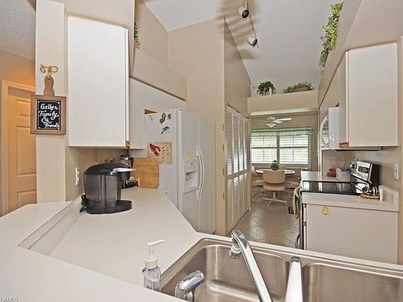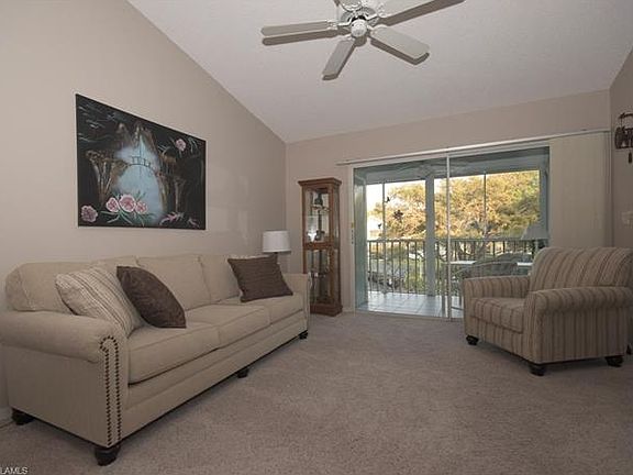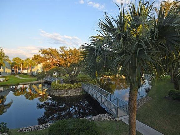 This upstairs end unit is on the lake, features vaulted ceilings and is move-in ready. Newer a/c, hot water heater, carpeting, stove, hurricane shutters, plantation shutters throughout and more. Split bedroom floor plan. There is a den with a closet that could be converted into a third bedroom if needed. Absolute best views of lake and bridge from the lanai as well as an extra storage closet. Every window has a storm shutter. Deeded carport space included. Ideal location within the complex on a cul-de-sac across from the large pool and clubhouse. Very well-maintained complex with two pools, clubhouse, low condo fees and no special assessments. Pet friendly too. Great North Naples location close to everything. The lovely furnishings are negotiable. If you are looking for a condo that feels warm and inviting, look no further. Call today to arrange your private showing before this opportunity is gone!