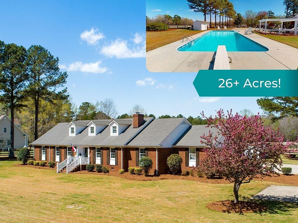 Luxury Equestrian Property w/ BRICK Ranch 3300 Sf in Main House & 4 Full Baths+ Sep 614 sf Guest Home w/ Full Bath/Office Situated on almost 27 gorgeous Acres~3 LG Pastures- Stables/2 Large Stalls +Run-ins for Horses or Cows +HUGE Wired 4 BAY Workshop w/ Roll doors~Great Private Country Location! Home Updated w/ Island Butcher Block Kitchen, Farm Sink, Marble tops, Double Ovens, 6 Burner Gas Cook Top, Tankless Hot Water Heater, 3 Seasons Room w/ view of LG INGROUND SALT WATER POOL & Patios, Riding Trails thru woods!
