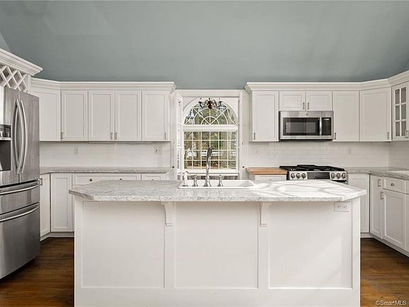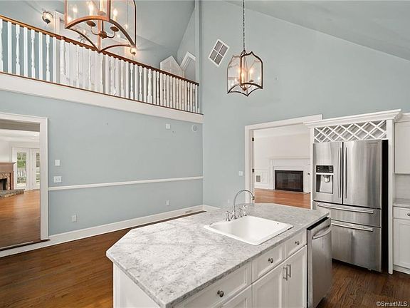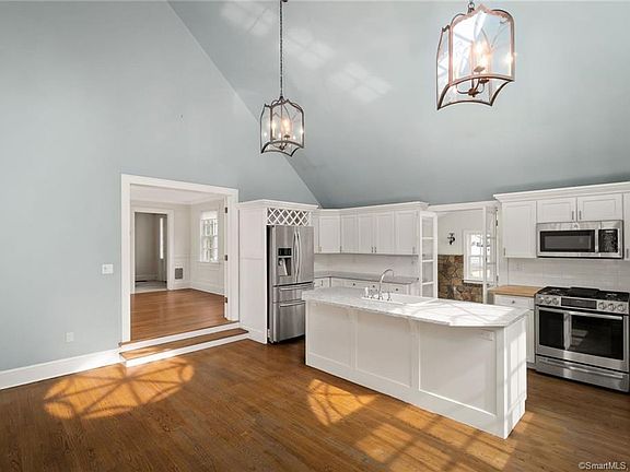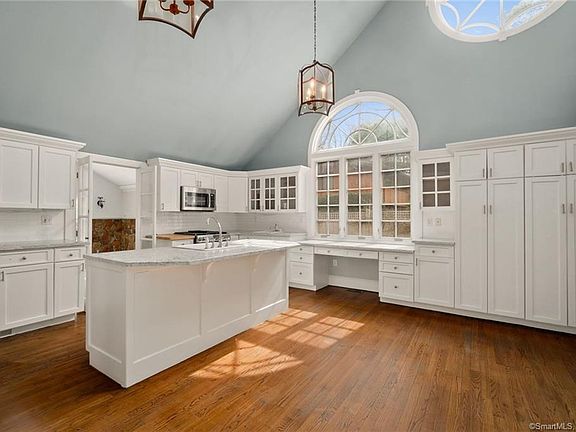 This unique home has fantastic entertaining spaces both inside and out that makes it ideal for gathering friends and family. There is a spacious kitchen with vaulted ceilings and a center island that leads to a gorgeous formal dining room with stone floors - perfect for large dinner parties. The family room with fireplace and French doors opens to a backyard deck, upstairs the kids playroom, homework room or Den with gas fireplace overlooks the kitchen. The flexible floor plan is ideal for a kids wing, guest or au pair suite. First floor Master Bedroom suite with walk in closet. Gunite pool and patio with outdoor fireplace and level yard. Walk to everything in Rowayton!