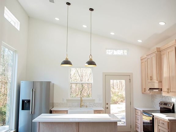 Welcome to this stunning modern retreat nestled in a peaceful, wooded setting. This home is walking distance of the Middle Fork of the Little Red River, with a tranquil natural branch flowing through the front of the property. This thoughtfully designed home features sleek vertical metal siding, a striking mono-pitch roofline, and clean architectural lines that blend beautifully with its natural surroundings. Inside, you’ll find a bright, open-concept living space with soaring ceilings, sealed concrete floors, and abundant natural light from oversized windows. The designer kitchen showcases custom wood cabinetry, a large center island, stainless steel appliances, and modern pendant lighting—perfect for entertaining or everyday living. Enjoy seamless indoor-outdoor living with easy access to the surrounding landscape, ideal for morning coffee, evening sunsets, and quiet weekends. Located just a short drive from Greers Ferry Lake, this home offers exceptional access to fishing, boating, and outdoor adventure. Whether you’re looking for a full-time residence, weekend getaway, or investment property, this unique home delivers modern comfort in a serene natural setting.