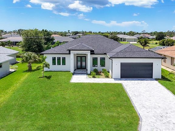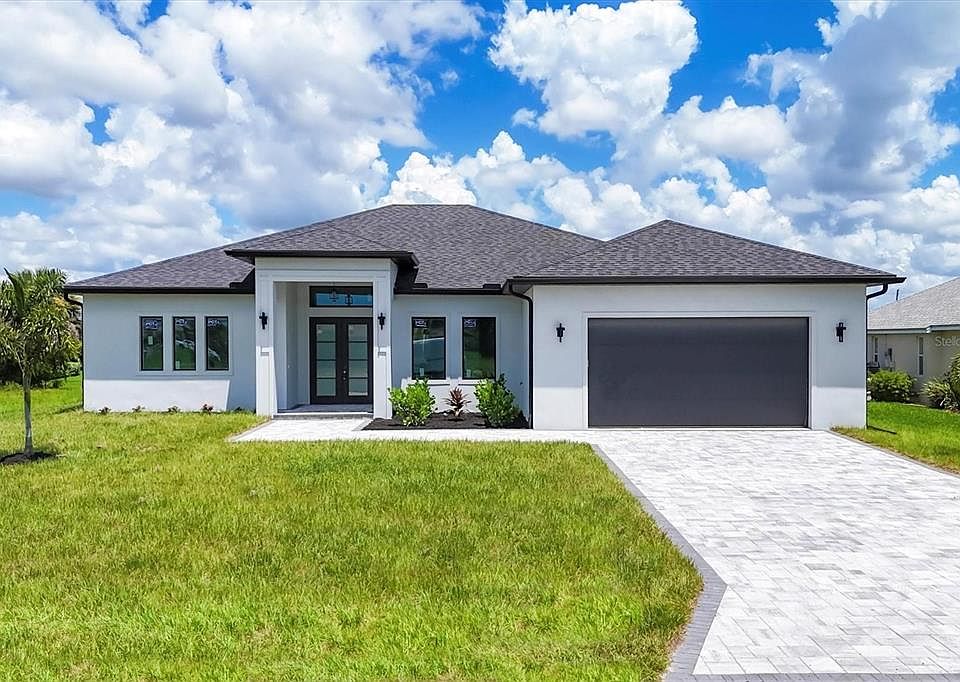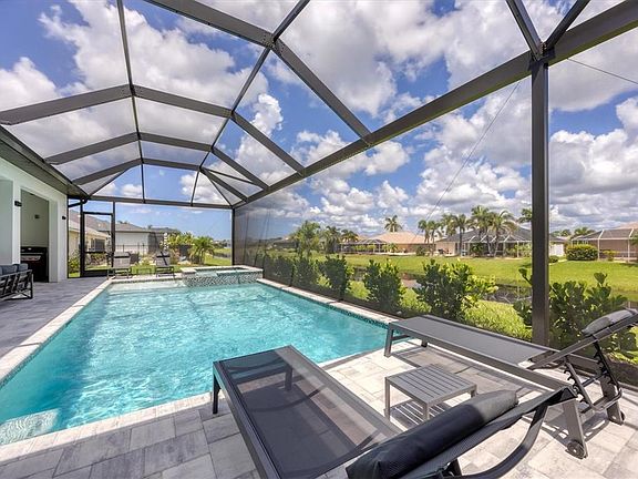 One or more photo(s) has been virtually staged. Immaculate Custom BRAND NEW BUILT WATERFRONT Home with Breathtaking Canal Views .Prime Location! POOL AND SPA! PUBLIC WATER AND PUBLIC SEWER! NO HOA OR CDD! ELEVATION FFE +11.47 FT. Step into luxury with this meticulously maintained, custom-built residence, perfectly positioned on one professionally landscaped lots with captivating views of a freshwater canal. Designed with an emphasis on open space, natural light, and elegant detail, this home offers the ultimate Florida lifestyle. Open-Concept Layout with soaring volume 10 FT ceilings and both single and double coffered accents CUSTOM KITCHEN QUARTZITE COUNTERTOPS HIGH END APPLIANCES(kitchen aid) PLUMBED FOR OUTDOOR KITCHEN AND SHOWER PANORAMIC VIEW POOL SCREEN CAGE HEATED POOL/SPA OUTSIDE BATHROOM Zero-Corner 8-Foot Sliding Glass Doors that seamlessly integrate indoor and outdoor living spaces 42” Soft-Close Wood Cabinetry,QUARTZITE countertops, breakfast bar, and UPGRADED KITCHEN AID stainless steel appliances in the upscale chef’s kitchen Casual Dining Nook with tranquil canal views. Diagonal Ceramic Tile Flooring throughout main living areas for a seamless feel Luxurious Master Suite featuring:Two spacious walk-in closets plus an additional storage closet. Direct access to the lanai via sliding glass doors. Spa-like en-suite bathroom with walk-around tile shower, dual QUARTZITE vanities, and private closet Guest Accommodations Two generously sized guest bedrooms with ceiling fans and large closets Second full bathroom with walk-in shower, perfectly situated to serve both guests and the pool area Outdoor Oasis Expansive 57' x 20' screened paver pool deck with a sparkling pool and tranquil fountain feature Oversized covered lanai, ideal for year-round entertaining Lush landscaping with concrete edging and canal-fed irrigation system (canal water saving on your water bill) Additional Highlights 2-Car Garage with durable epoxy-coated flooring Brick paver driveway and walkways enhance the home’s stunning curb appeal Impact-resistant windows and doors for security and peace of mind Substantial windstorm insurance credits thanks to impact protection Centrally located near top-rated golf courses, fine dining, boutique shopping, and world-class marinas with direct access to the Intracoastal Waterway and the Gulf of Mexico. Just a short drive to pristine beaches, nature preserves, and some of the best fishing in the state.Experience the best of Florida with nearby beaches, golf courses, and outdoor recreational activities just a short drive away. Don't miss out on the chance to own this extraordinary home.