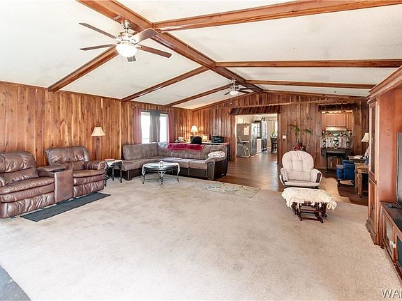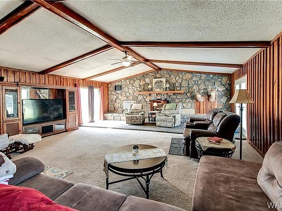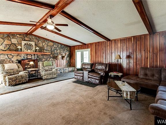 Check out the HUGE living room in this home with cherry wood walls and a wall-to-wall stone fireplace! This living room is every outdoorsman's dream! The galley kitchen has been updated with new cabinets, countertops, and appliances. There is new LVP flooring in the kitchen, dining room, hallway, and part of the living area. This level lot is completely fenced and has gates for a private yard, making it perfect for pets. The storage building and detached carports will remain as part of the purchase price. A yard like this and a home this size are hard to find.