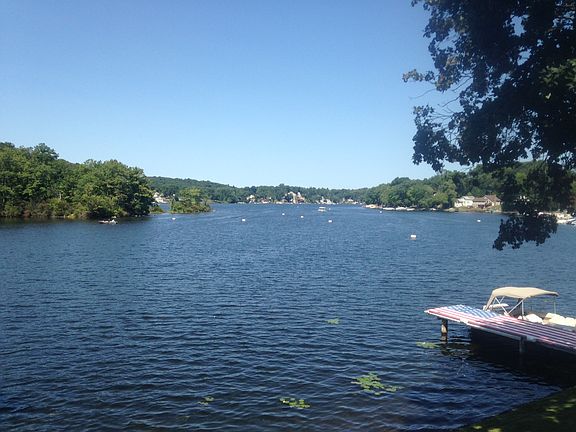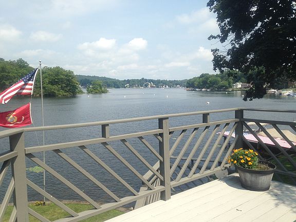 70 Ft of lake front w/private launch, dock w/swim area, level lawn & patio. Huge deck w/awning & cabana. Custom Ranch w/circular drive, hardwood flooring, public water/sewer, natural gas, LOW TAXES! Enjoy lake front views & amazing sunsets from spacious great rm w/floor to ceiling windows dining & sitting area, vaulted ceiling & slider that leads to huge upper deck! Open floor plan from living rm to kitchen w/wood cabinetry, center island w/breakfast bar & built-in pantry w/desk. 1st floor Master w/2 double closets, custom wood work, wood flooring & views to the lake. Lower level walk-out offers Fam rm w/brick wood burning fireplace open to game rm/gym with floor to ceiling windows & slider to patio at lake side. Two additional bedrms, full bath. Commuter location 1 mile t rt 80, walk to train, 1 hour to NYC