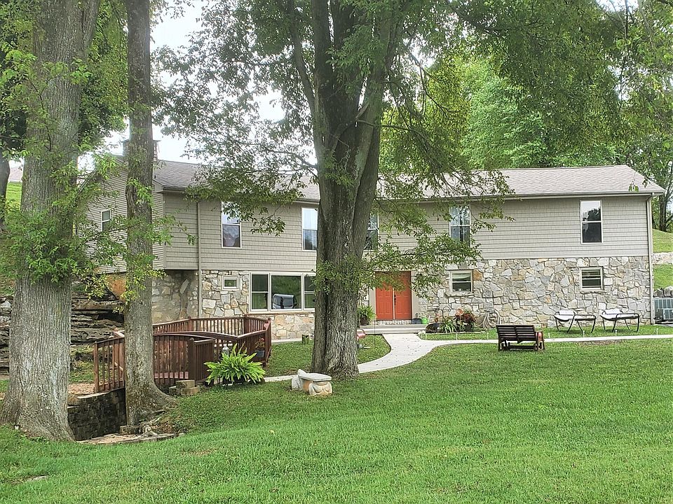 Secluded 3 bedroom, 3 bath, stone & Vinyl, setting on 1.58 acres, family room with fireplace, dining room, kitchen, music room, great room with computer/office area, kitchen with bar, patio, creek, trees, south of town. Much, much more!