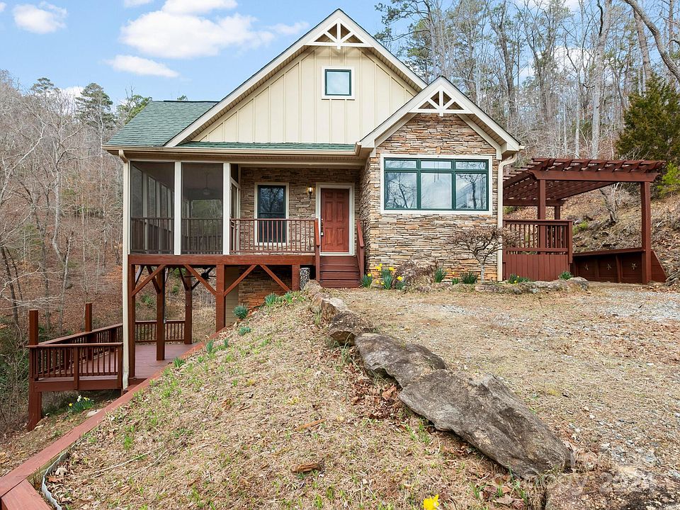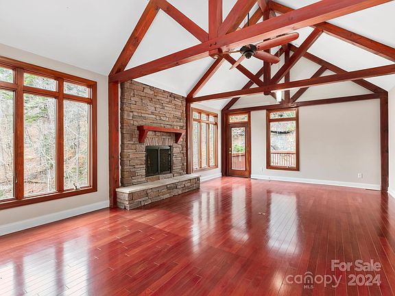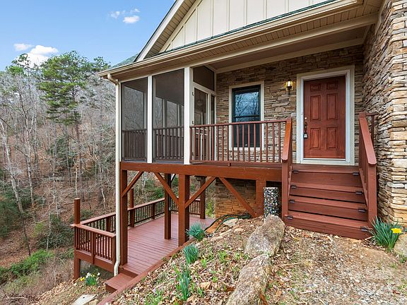 Welcome to your serene mountain retreat! This captivating 3-bedroom, 2-bathroom home offers an idyllic escape with no HOA dues. Nestled on nearly 4 acres, it boasts a stunning waterfall viewable from multiple vantage points, ensuring a tranquil atmosphere where no neighbors are in sight. Experience the charm of the living room, featuring vaulted ceilings with exposed beams, a cozy wood-burning fireplace with a propane line, and a fresh coat of paint throughout the house. The kitchen is a culinary dream with a double oven, a 5-burner cooktop, and ample cabinet space for all storage needs. Retreat to the master bedroom, a haven of relaxation with a luxurious en-suite that includes both a walk-in shower and a tub. The home's common areas and master bedroom are adorned with engineered hardwood flooring, while the downstairs bedrooms boast new LVP flooring. The mountain views and natural beauty seen from one of the many decks, offer a perfect backdrop for relaxation or entertaining.
