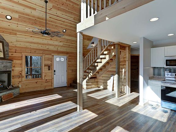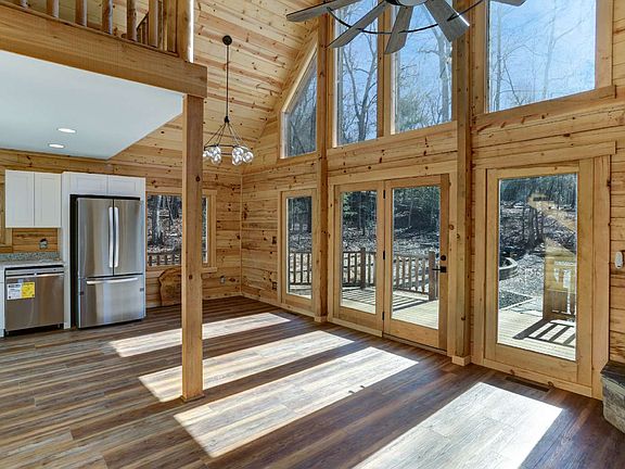 NEWLY CONSTRUCTED, DEEDED Lake Chatuge ACCESS, backyard (mountain view & balcony)ENTIRE HOME & ATTIC HAVE SPRAYED FOAM INSULATION. Nestled in the rolling hills of the North Carolina mountains is a true oasis. Set on a serene, tree-lined level lot, this home features 3 cozy bedrooms & 2 full bathrooms. Step inside to discover an inviting open floor plan that flows seamlessly into the great room, highlighted by a soaring cathedral ceiling & a stunning stacked stone gas log fireplace. The interior strikes a perfect balance w/ a tasteful blend of rustic wood elements & smooth drywall finishes. The heart of the home is the kitchen, equipped w/ sleek granite countertops & a suite of stainless-steel appliances, ideal for both casual family meals and entertaining guests. Floor-to-ceiling windows bathe the space in natural light, while the loft sitting area offers a quaint retreat. Indulge in the luxury of the guest bathroom's tiled tub or the master's glass-tiled walk-in shower, complete w/ multiple shower heads for a spa-like experience. The master bedroom is a private haven featuring its own balcony where you can savor breathtaking mountain views. Outside, the expansive wraparound deck provides the perfect backdrop for relaxing, dining al fresco, or simply enjoying the tranquil surroundings. A large, level parking area offers ample space for vehicles. This picturesque cabin is more than just a home, it's a lifestyle retreat where every day feels like a getaway.
