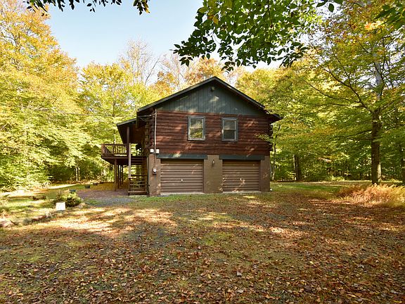 Rustic log home tucked away on a beautiful 2.10 acre property, ideal for the nature enthusiast or anyone looking for a peaceful retreat and wooded paradise! Open floor plan with a wood stove w/a gorgeous stone surround - stay extra cozy all winter long. Big eat in kitchen plus plenty of room for a large dining room set up if needed. Master bedroom with a full bath attached. Giant rec room downstairs with room for your pool table. Covered front porch and a deck out back offer plenty of opportunity to enjoy the phenomenal woodland setting. Great location for accessing routes 380/80 and the NE Extension to get just about anywhere. Ideal primary residence or weekend getaway. Community has low dues and has a beautiful lake for your kayaking enjoyment :)