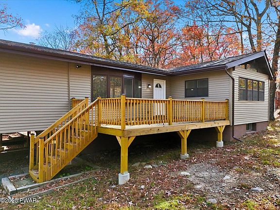 Move in ready and already updated. This 3 bedroom, 1 bath home was renovated from top to bottom with new roof, new siding, a brand new kitchen, updated bath and durable LVP flooring. The main level feels open and bright with vaulted ceilings, exposed beams and big windows that look out to the trees. The white kitchen has granite counters and plenty of cabinet space so everyday cooking is easy. There are two bedrooms on this floor and both have cedar closets.The finished walk out lower level is the extra space everyone wants. It has a cozy wood paneled family room, a wood stove for winter, a built in bar and a slider to the yard. The third bedroom is down here too, so it works well as a guest room or home office and it also has a cedar closet.Outside you get a large front deck for coffee, relaxing and enjoying the setting. The lot feels natural and low maintenance. Neutral finishes inside make it simple to furnish and enjoy right away. Some photos are virtually staged to show how the rooms can be set up. If you have been looking for an updated home with character and a finished walk out lower level, put this one on your list.