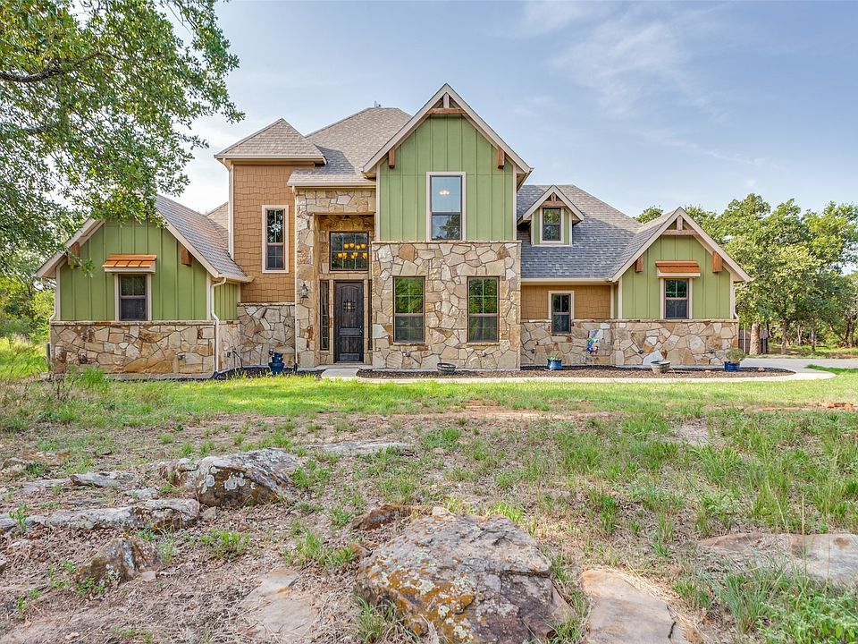 The exterior of the home showcases a stunning blend of rock, stone, and brick craftsmanship set against the picturesque backdrop of lush, expansive acreage. The guest house adds value and versatility, perfect for visitors or additional living space.