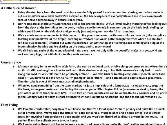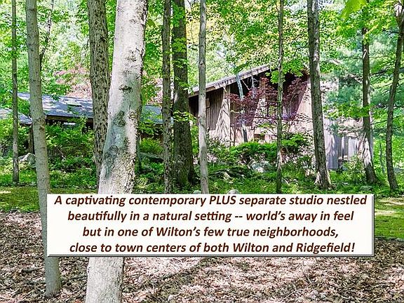A nature lover's paradise! This timeless contemporary sits back on a very private 2 acre lot with treed grounds that offer endless opportunities for adventure & exploration, & a pond that's perfect to enjoy wildlife in summer & ice-skating in winter. You'll feel worlds away but are just 2mi from shopping/restaurants & Rte 7 corridor, close to Wilton & Ridgefield town centers. The home has an easy living design for effortless indoor-outdoor enjoyment, an open flow, many recent updates, large windows & sliding doors for a gloriously sun-drenched interior, & wide doorways for stunning views of nature from each room. You'll love the house, grounds & separate 576sf studio perfect for music/art/gym/yoga/parties or as a home office (incl in sf).