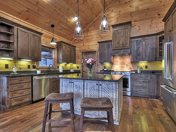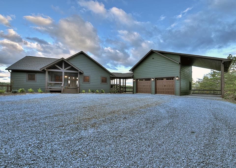 URBAN MOUNTAIN COMPOUND – This custom home is perfect for those looking for a simpler way of life yet offering the best in modern day living. Offering the design & sophistication both inside & out w/ the picture perfect backdrop of layered mountains & view of the Toccoa River in the distance making you feel like you're living in a storybook. Spacious open floor plan offering easy ranch style living w/ full finished walkout terrace level. Featuring 3BR's, 2.5 BA's with all essential living elements on the main level including primary BR/BA suite which offers a jetted soaking tub & separate walk in tile shower & a huge closet that offers flexibility of full time living or second home living. Enjoy the views from every room w/ lots of windows & natural light overlooking this spectacular mtn setting in every direction. Gourmet chef's custom kitchen w/ circle saw custom cabinetry & stainless appliances w/ large working island/bar. Cathedral ceilings throughout w/ other custom features including floor to ceiling Rock FP in GR, hardwood floors, granite countertops, custom milled trim work w/ custom detailed design features throughout + more. Large covered back porch w/ floor to ceiling Rock FP offers the best of outdoor living & be greeted in the mornings with the most perfect brilliant orange-colored sunrises sometimes complimented with a peaceful fog lifting from the river valley below. Gentle laying property around home w/ fenced in area great for the kids or your furry kids. Fin. Terrace offers Rec. Rm/Den & Media Rm. + 2 additional BR's plus an additional flex BR or office/workout room all opening onto terrace level deck & yard. Oversized 2 car garage w/ additional covered bay great for RV/Camper or additional vehicle w/ plenty of room for workshop/storage. Located less than 10 minutes from historic downtown Blue Ridge w/ NO formal HOA & is located w/ end of the road privacy through your own “gated compound” on 1.5 acres of beautiful hardwoods & native fl
