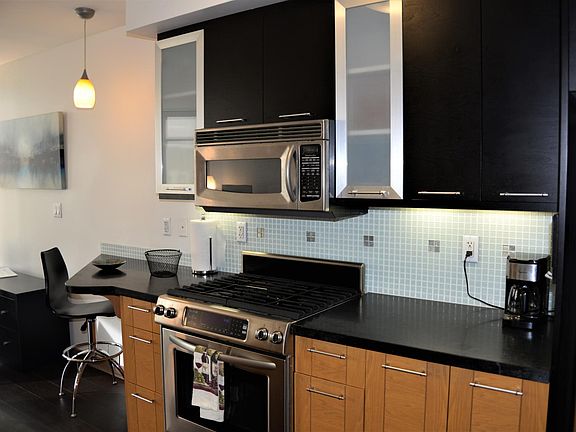 The property features an airy 7th floor location with Caltrain Station, Bay Bridge and city skyline views, a modern, a fully equipped kitchen, a living area, queen size, and a washer/dryer.