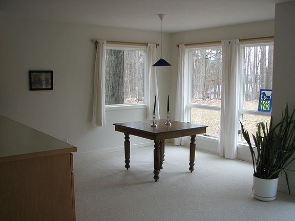 This is a ranch style home in a quiet rural neighborhood. The lot has trees, new lawn, open field. Only 12 minutes to Champlain Center Mall. Open floor plan, lots of closet space (8 separate closets), two car attached garage. Custom built, extremely energy efficient with passive solar design, zoned in-floor heating, high R-values (R-28 walls, R-60 ceiling), wood stove, and solar hot water heat to reduce fuel use. New roof. South-facing deck overlooking tree-lined yard. More: Cedar siding, Entry porch, Sliding doors to deck from master bedroom and living room, Oil-fired boiler, Laundry/utility room with water softener, w/d hookups and sink. Comes with wood stove, fridge, dish washer, curtains, whole-house water filter.