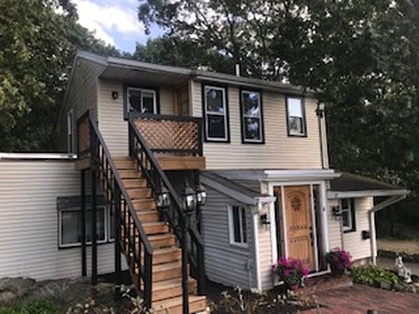 Renovated in-law apt!! 2-story home oozes charm & character. Whitman's Pond/Cavern Rock neighborhood, feel like New Hampshire w/ woods behind you & pond across the way, but close proximity to T, Rte 3, commuter rail, restaurants & shopping. Beautiful 'speak easy' front door leads to open area concept w/ gas fireplace, dining area & kitchen. Enjoy breakfast at the granite counter overlooking updated kitchen w/ s/s appliances. Living room has vaulted ceiling & exposed beams; Go out French doors to outside oasis: tri level deck w/ above ground pool, stockade fenced yard, detached garage. 2 bed/1st unit, full modern bath, bonus room (for laundry room or small office) complete 1st floor. All hardwood flooring. Enter apartment by separate staircase out front leading to small deck w/ partial views of pond. Modern renovated 2 bed 2nd unit. Kitchen: soft closing cabinets, granite counters, dbl sink, s/s appliances. Bathroom: custom shelving. Roof, gas furnace, & hot water heater new. No OH9.14