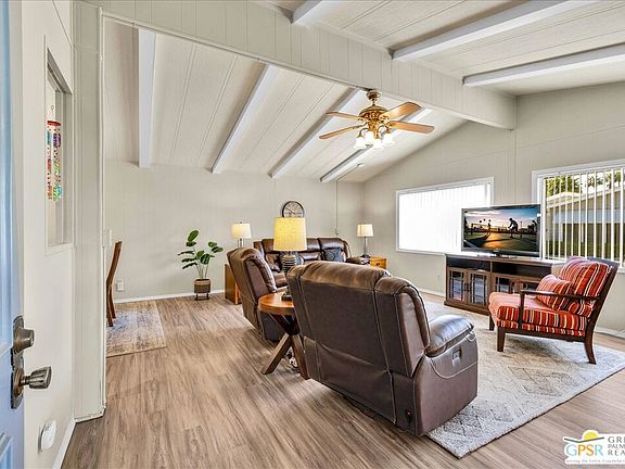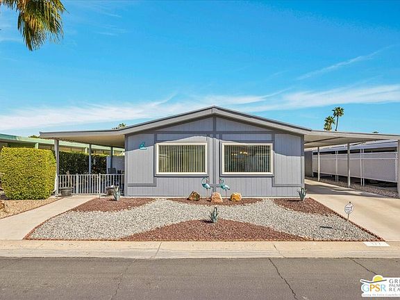 MOVE-IN READY & PRICED TO SELL - This 2 Bed / 2 Bath home offering 1,344 square feet of thoughtfully updated living space is perfectly positioned just one block from the clubhouse and main pool, with mountain views from the home's private hedge-lined patio. Recent energy efficient updates include a new HVAC system, including pipes, fittings, and thermostat (2022) and new dual pane (Low-E) windows throughout (2022). The kitchen boasts a new 5-burner Bosch cooktop and dishwasher (2024) range hood, sink, faucet, quartz countertops, as well as cabinets and soft-close drawers (2022). You'll also find new laminate flooring & baseboards throughout the living area and wall-to-wall carpeting in both bedrooms (2022) a remodeled guest bath featuring a new shower with tile walls, glass door, shower head, sink, faucet, toilet, mirror, and lighting. The primary bedroom offers a generously sized walk-in closet and a recently updated ensuite bath featuring 2 separate sinks! This home is being sold furnished (per inventory list). The attached carport provides ample covered parking and extra storage space in the shed with a built-in workbench. The Canyon's amenities include 2 sparkling pools & spas, a welcoming clubhouse, library/card room, billiard room, fitness room, craft room, indoor shuffleboard, and a beautiful multi-function room equipped with a stage and professional-style kitchen, perfect for hosting events. With the clubhouse, main pool, and tennis/pickleball courts just a block away, this home's location in the community is ideal. The proximity to PSP, shopping, restaurants, and all that desert living offers makes this the perfect home for year-round living or a vacation getaway. The Canyon is a beautifully maintained, gated, premier 55+ community. Buyers must be park-approved. A minimum credit score of 750 and proof of income 3 times the monthly space rent of $960 is required. 1 pet is allowed, weighing no more than 20 lbs. Buyers and their agents to verify current space rent fees and square footage.
