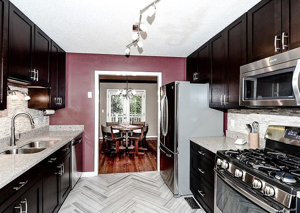 Love where you live! This fantastic end-unit townhome in desirable East Cobb is convenient to the interstate, great schools, shopping, and restaurants. With one of the largest floorplans available in the community, you will love how spacious and open the family room is with soaring vaulted ceilings. The fully updated kitchen features granite countertops, quality cabinets to the ceiling, stone backsplash, stainless steel appliances, and ceramic tile floors laid in a beautiful herringbone pattern. Off the kitchen is the dining area, which leads through the French doors to the back deck surrounded by mature trees and bamboo for complete privacy. Both bedrooms are equally spacious, with the primary on the upper level and the secondary on the main level. The primary bedroom also boasts 2 large walk-in closets with a huge primary bathroom with vaulted ceilings, skylight, separate shower and soaking tub. Additionally, the loft upstairs overlooks the family room below and serves as a great office space or place to hang out. Behind the 2-car garage, there is partially finished basement consisting of 2 large rooms, laundry room and wet bar. Plenty of storage space and potential! If you're looking for move-in ready at a fantastic price point - you've found it!