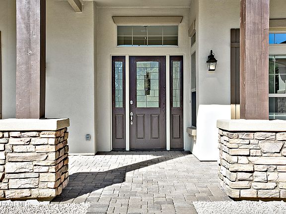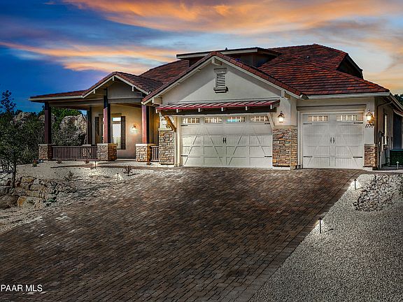 Gorgeous, serene setting with boulder outcroppings, you will find perfection in this 3200+ sq. ft. single level, new build Carrington home. Enjoy Thumb Butte views from the expansive paver front porch perfect for entertaining. Architecturally interesting, the floor plan features 10' ceilings, tile and LVP flooring throughout, great room w/ stacked quartz fireplace + abundance of windows & french door to paver back patio. Party ready kitchen w/ shaker style cabinetry, quartz counters, huge work island, s/s appliances, open to dining area. Inviting flex area w/ wall to wall cabinetry provides added space for gathering. Spacious primary bedroom offers dual closets & full en suite. 2nd en suite bedroom with privacy patio + two addt'l bedrooms for guests & home office.