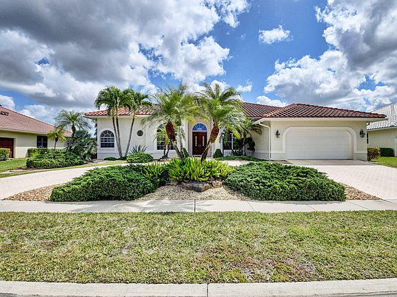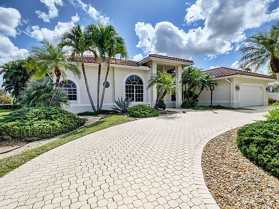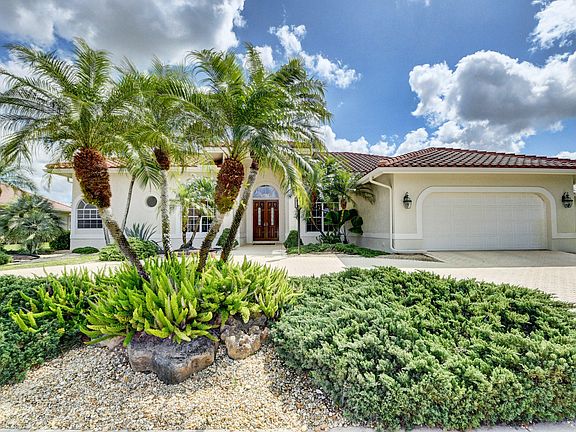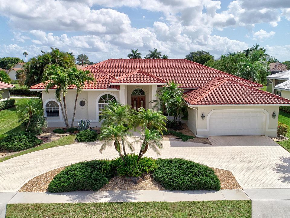 GOLF LEVEL MEMBERSHIP & EQUITY REQUIRED. Lovely, truly move-in ready custom home in Stonebridge Country Club. The exterior of the home is impressive with a decorative circular driveway, 2 bay garage plus golf cart garage, nicely landscaped rock gardens, freshly painted neutral tones, and a newer roof (2017, per PBC permits), two AC's replaced, one in 2014 and the other in 2016. Upon entering the home, you have perfect, unobstructed views to the screened lanai, pool, and golf course beyond. Neutral tile in living areas, kitchen and baths. Carpeted bedrooms provide softness on bare feet. Ample recessed lighting, crown mouldings throughout, ceiling fans, and traditional lighting and finishes make this home so easy to love! The renovated kitchen has light woodtone cabinets,(MORE)