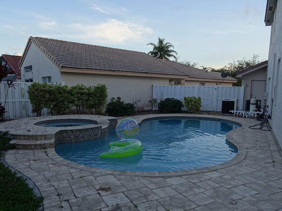 Welcome to the home you've been waiting for! Situated on a pie-shaped lot, this home is ready to entertain all family and friends. Both the interior and exterior have recently been painted. The property features an upgraded kitchen along with real bamboo flooring throughout the first level. Enjoy watching your favorite movie while cooking with the generous flow from kitchen into family room. All bedrooms located upstairs and the property is equipped with paneled hurricane shutters. A/C and water heater are fairly new. Pool pump is brand new. Backyard offers an abundance of space with the pool and jacuzzi lying adjacent to the home. Silver Lakes provides 24-hour roaming security with plenty of parks and common areas.