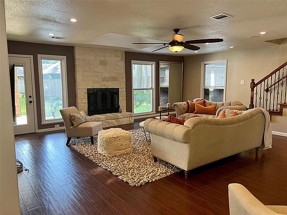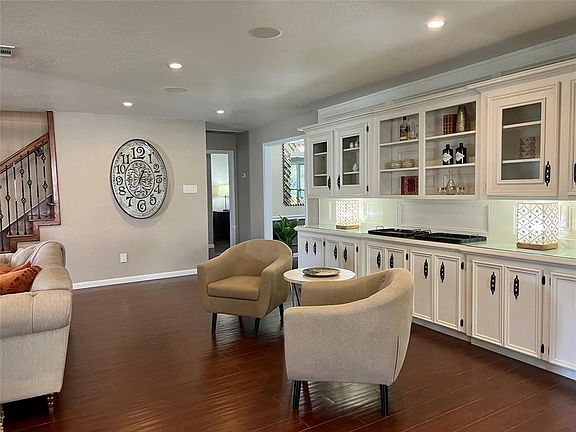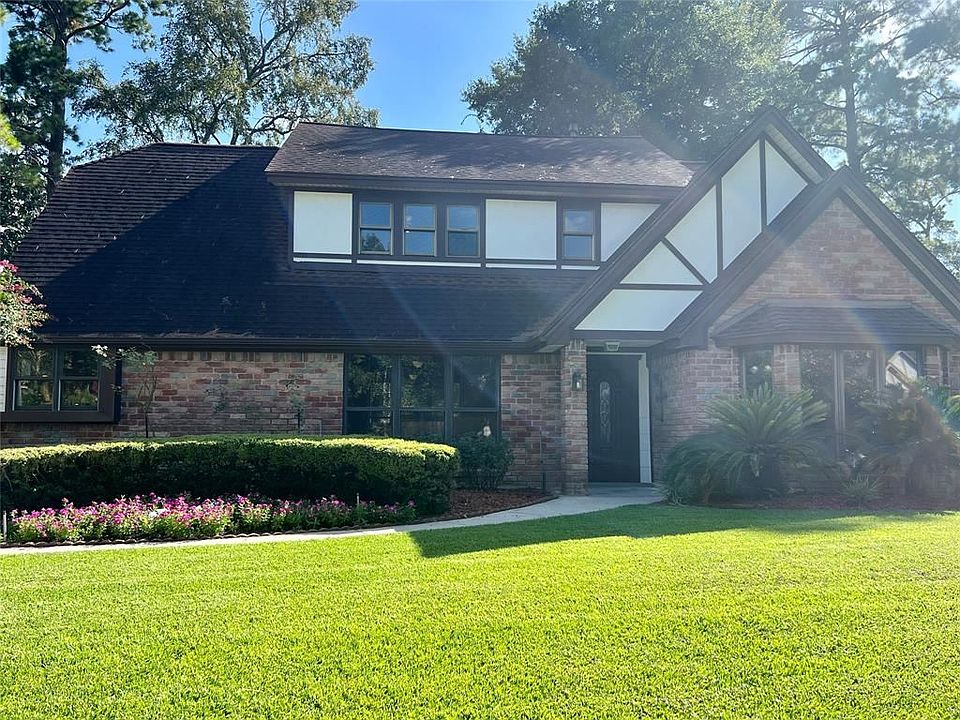 Beautifully updated home on expansive lot. Charming Tudor-style elevation & welcoming landscaping. Attention to detail is everywhere! Inside are easy-care wood-look tile floors, high ceilings, spacious rooms, recent paint. Entertaining is easy here -- the family room offers stunning fireplace, abundant lighting, plus nearby casual dining. Next, a spectacular renovated kitchen has custom cabinets, extensive island, under-cabinet lighting & beautiful granite w/ tile backsplash. Kenmore Elite S/S appliances include convection cooktop, double ovens, counter-depth refrigerator. Formal dining overlooks a manicured front yard. First-floor primary bedroom suite won't disappoint! Renovated bath w/ custom cabinets, 2 walk-in closets & fantastic tub/shower. Laundry room & half bath are updated too! Upstairs is a huge gameroom plus 3 more bedrooms & full bath. Enjoy the big covered back patio & gorgeous lawn. Bonus room over garage w/ half bath & central HVAC ready for your dream design ideas!