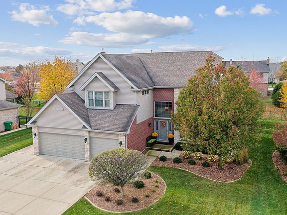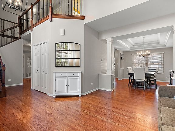 A stunning executive-style, two-story property boasting premium features and modern amenities at every turn. Masterfully crafted 4 bedroom, 2 1/2 bath, highlighted with crown molding, wainscoting, designer ceilings, and decorative lighting. Freshly painted and beautiful window treatments throughout, including blinds, motorized shades, and shutters. Enjoy cooking and dining in style with cherry wood cabinets, sleek stainless steel appliances, and a convenient breakfast bar with seating for 5. Your family room experience is enhanced with elegant custom cabinetry and superior audio quality. Step into the expansive 20x25, 4-seasons room to enjoy the game on TV with a soaring 13' shiplap cathedral ceiling, featuring a breathtaking stacked stone gas fireplace with custom mantel, heated tile flooring, and cozy built-in bench window seats with storage. The adjacent 25x19 low-maintenance deck is perfect for outdoor entertaining and relaxation, complete with a retractable sunsetter for shade. Retreat to your primary ensuite with an enlarged walk-in closet and a sophisticated built-in cabinet/organizational system. The luxurious bathroom features a jacuzzi, double comfort-height sinks, and a separate shower. Remaining spacious bedrooms include a versatile 4th bedroom designed as a junior suite with its own walk-in closet, study/makeup nook, and shared bath. Attached, front-load, 3-car garage with epoxy flooring and numerous racks for storage. Fully insulated for energy efficiency and convenience. The exterior staircase gives additional easy access to the unfinished basement for storage, a private party entrance, or a related living option. New storm door, basement windows, and window well security covers. Perfectly manicured exterior with a self-draining sprinkler system to keep your lawns lush and green without the hassle. Big ticket items include a new water heater (2022) and a 2nd floor furnace and AC (2023). Walk to community park. Enjoy the best of suburban living with easy access to METRA, top-rated schools, premier shopping destinations, and local amenities.