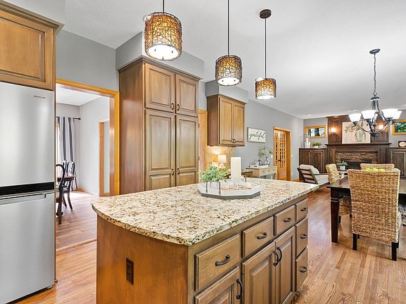 offers another statement fireplace, large wet bar area and bonus room perfect for workout or hobby. The wooded views out back w/ the large deck and brick fireplace is ready for your summer fun. Award winning Lakeville schools w/ close access to freeways, shops and parks.